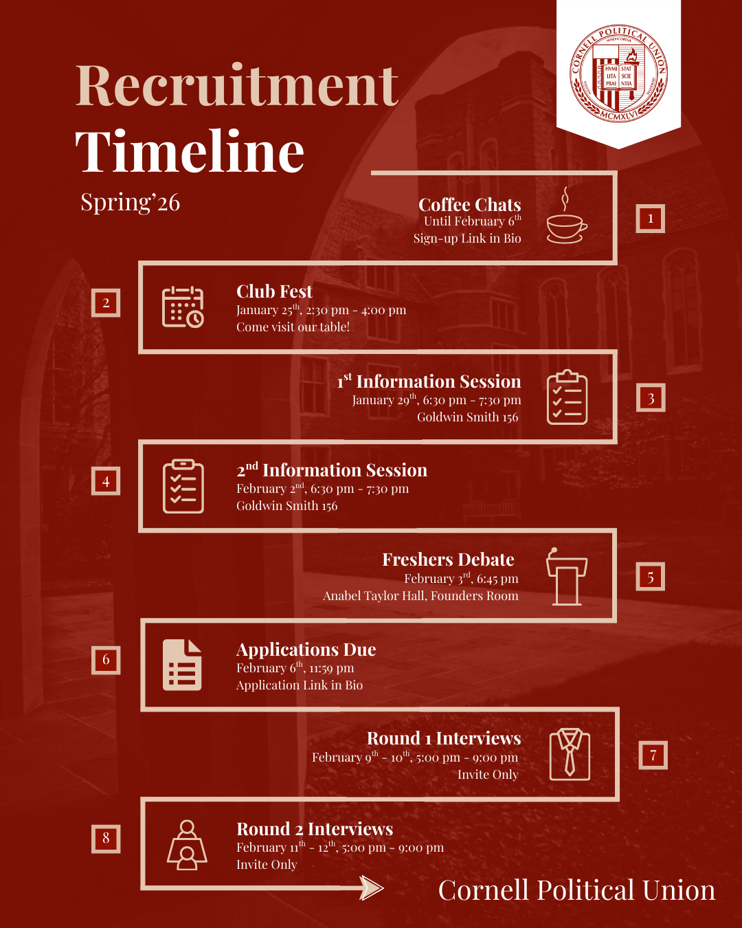 Recruitment for Spring 2026 Now Open Apply for Coffee Chat here.Apply to the Cornell Political Union here.